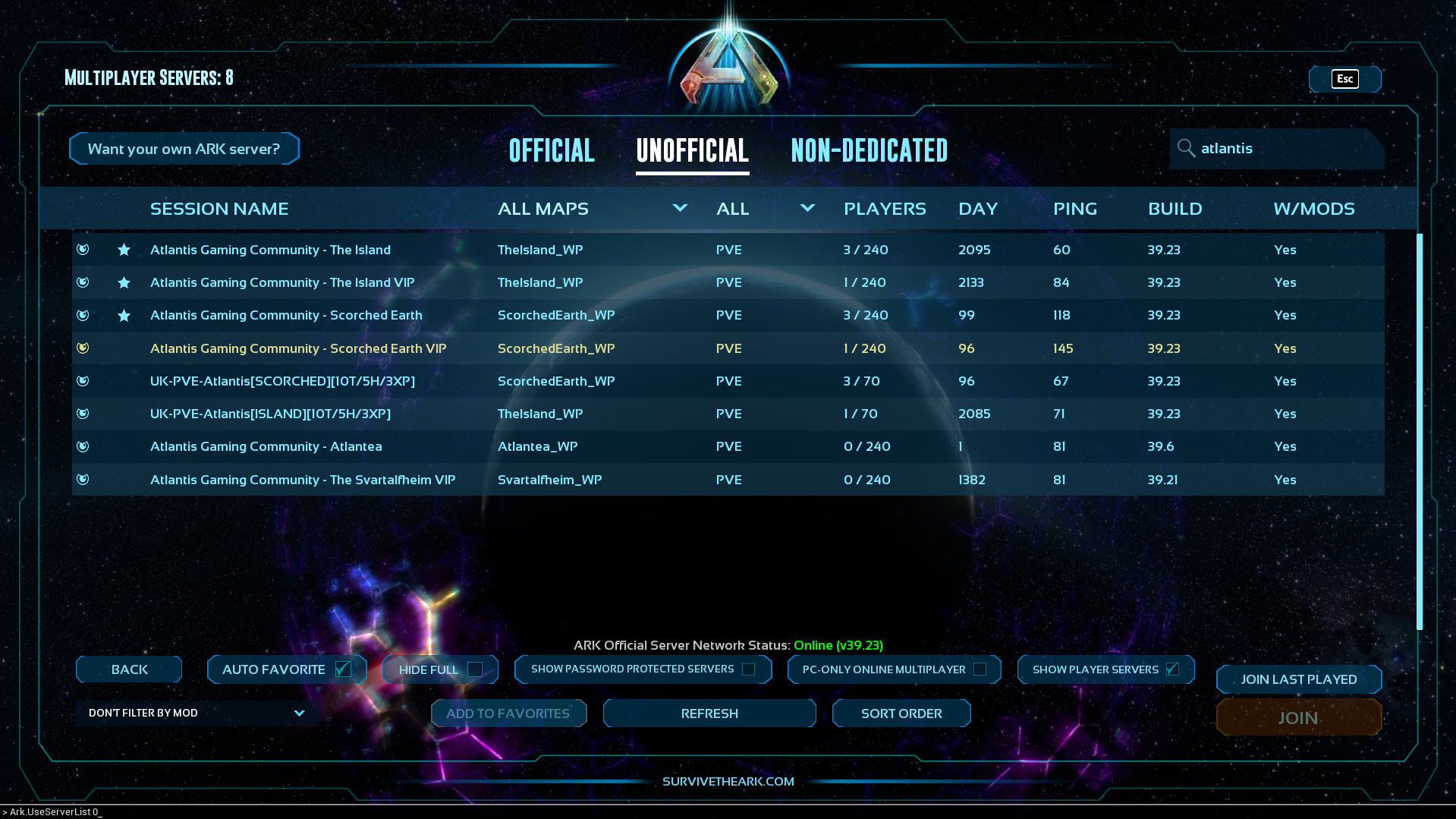 OPEN CONSOLE COMMANDS AND ENTER "Ark.UseServerList 0" exactly as that is between the qutotations. Then search for Atlantis Gaming Community, or Atlantea. Thank you.