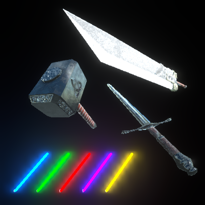 Includes: - Red lightsaber - Blue lightsaber - Green lightsaber - Purple lightsaber - Yellow lightsaber - Buster sword - Damascus sword - Mjolnir