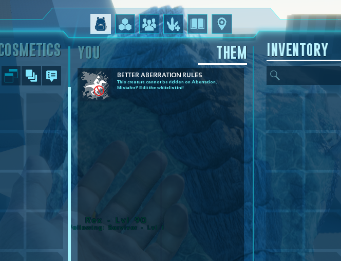 Author: MamaPuma Downloads: 2,005 File Size: 1.1 MB Created: 2025-05-20 Updated: 2025-06-07 Mod ID: 1269460 Copied to clipboard Categories: Rebalancing Creatures Better Aberration Rules [Discontinued] Blocks the riding of non-native dinos to Aberration, while still allowing them to exist on the ARK for breeding or other purposes. Description Images Better Aberration Rules [Discontinued] Images Works on ARKOLOGY! Rex Can't Be Ridden Even With Saddle On Buff In Inventory of Rex Can't Ride Rex Splash Image All raptor variants welcome, but those pesky rexes and wyverns are not! Icon