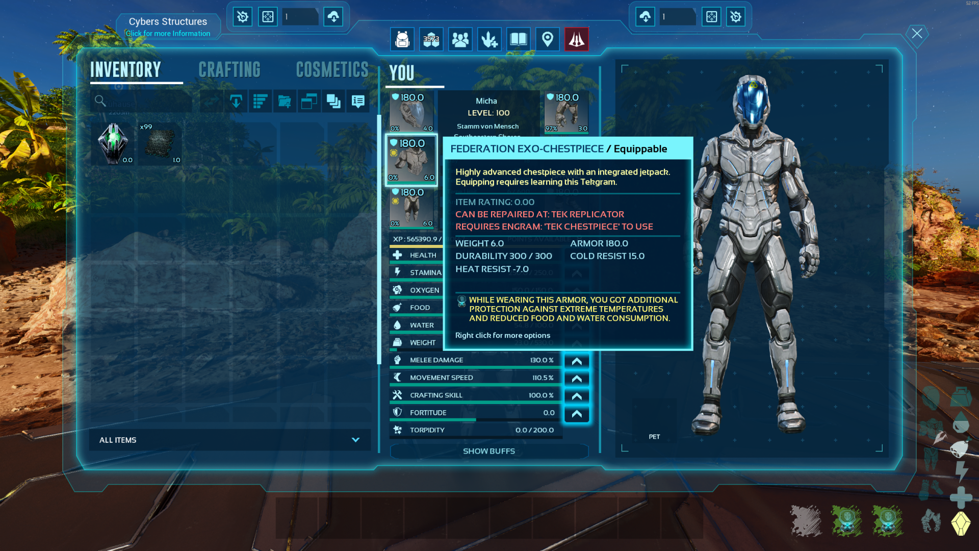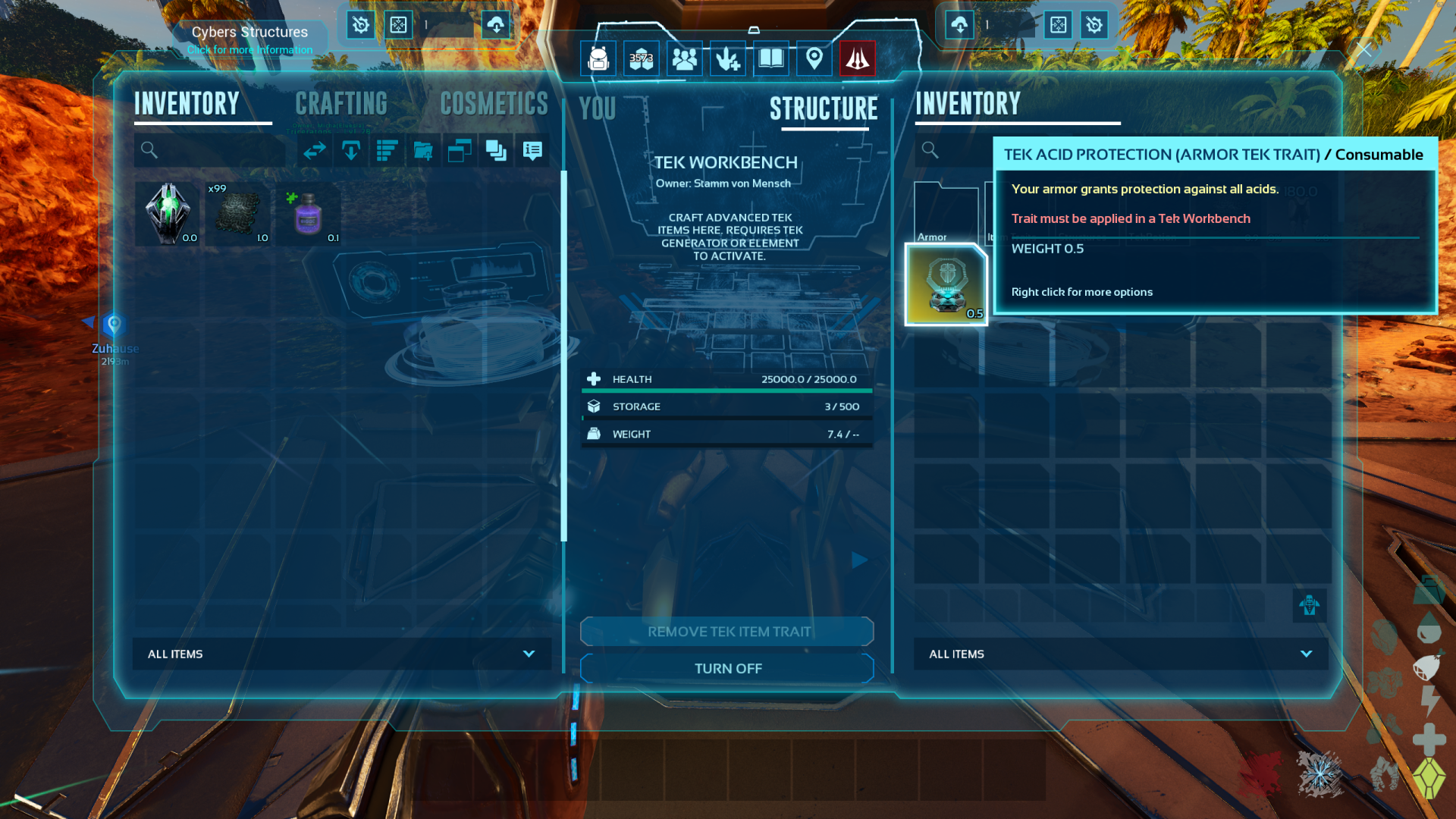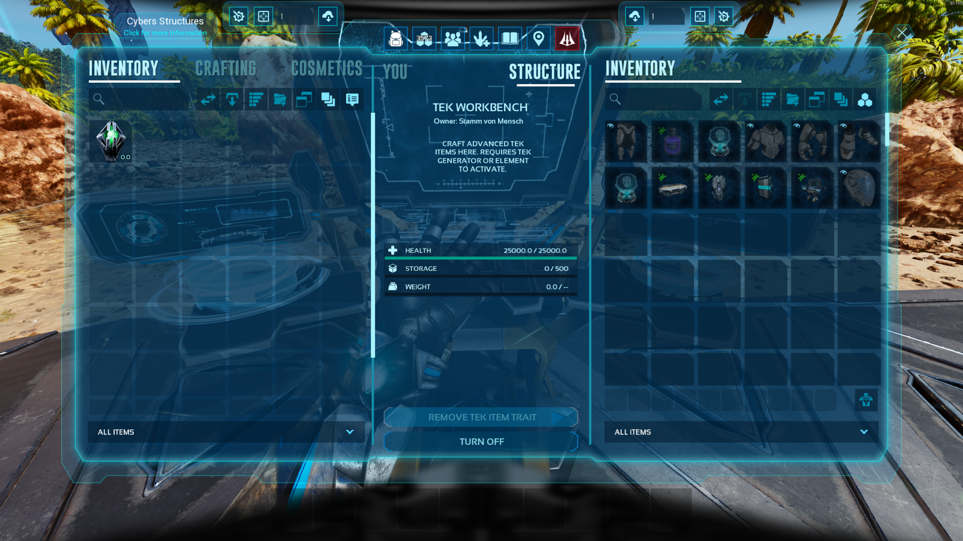 Author: Eluesia Downloads: 4,251 File Size: 101.4 MB Created: 2025-07-08 Updated: 2025-09-05 Mod ID: 1302257 Copied to clipboard Categories: Rebalancing Structures Outfits Weapons Advanced Tek Advanced Tek Items as additions Description Images Engrams Items Advanced Tek Images Tek Item Trait Tektrait Acid Protection in Workbench. Tek Item Trait Tektrait Lifesupport on Tekchest. Exo Federation Skin Exo Federation Skin with Tekhelmet overlay in first person deactivated. Tek Storage Tek Storage with Equipment Content in Open state. Tek Storage Tek Storage with Storagename Hologram. Tek Forge Tek Forge with auto deactivation when nothing is to refine before next element used. Tek Forge Tek Forge with calcualted refiningtime. Tek Basetrough Tek Trough with higher range. Tek Workbench Here you can craft all Items of this mod and apply/remove Tek Traits.