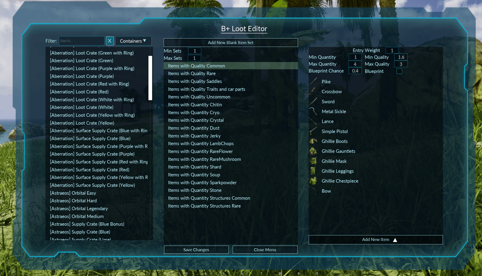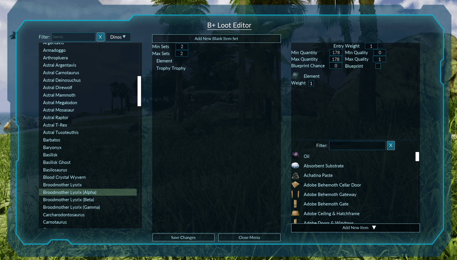 Author: Boss_89 Downloads: 11,522 File Size: 1.8 MB Created: 2026-02-04 Updated: 2026-02-07 Mod ID: 1412861 Copied to clipboard Categories: General B+ Loot Editor In game loot editing via UI interface Description Images Dino Drop Inventory B+ Loot Editor Images Screenshot_2026-02-04_053130_8_66.png Screenshot_2026-02-04_053130_8_66.png Screenshot_2026-02-04_053218_1_67.png Screenshot_2026-02-04_053218_1_67.png