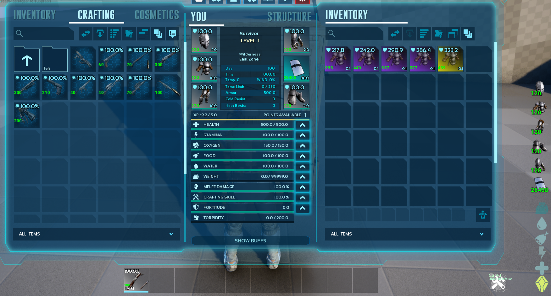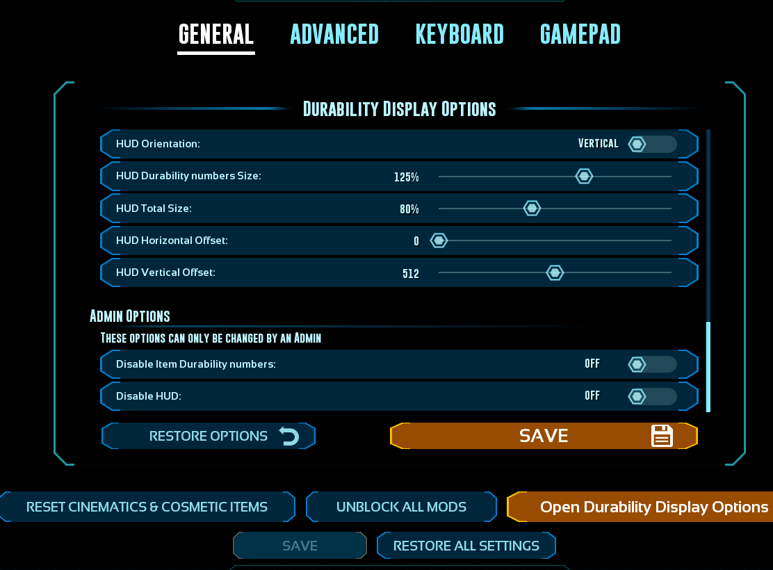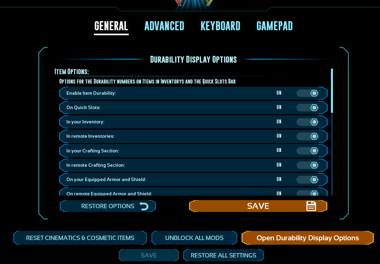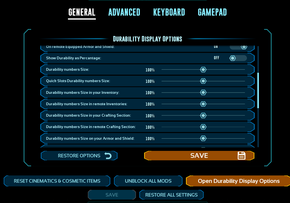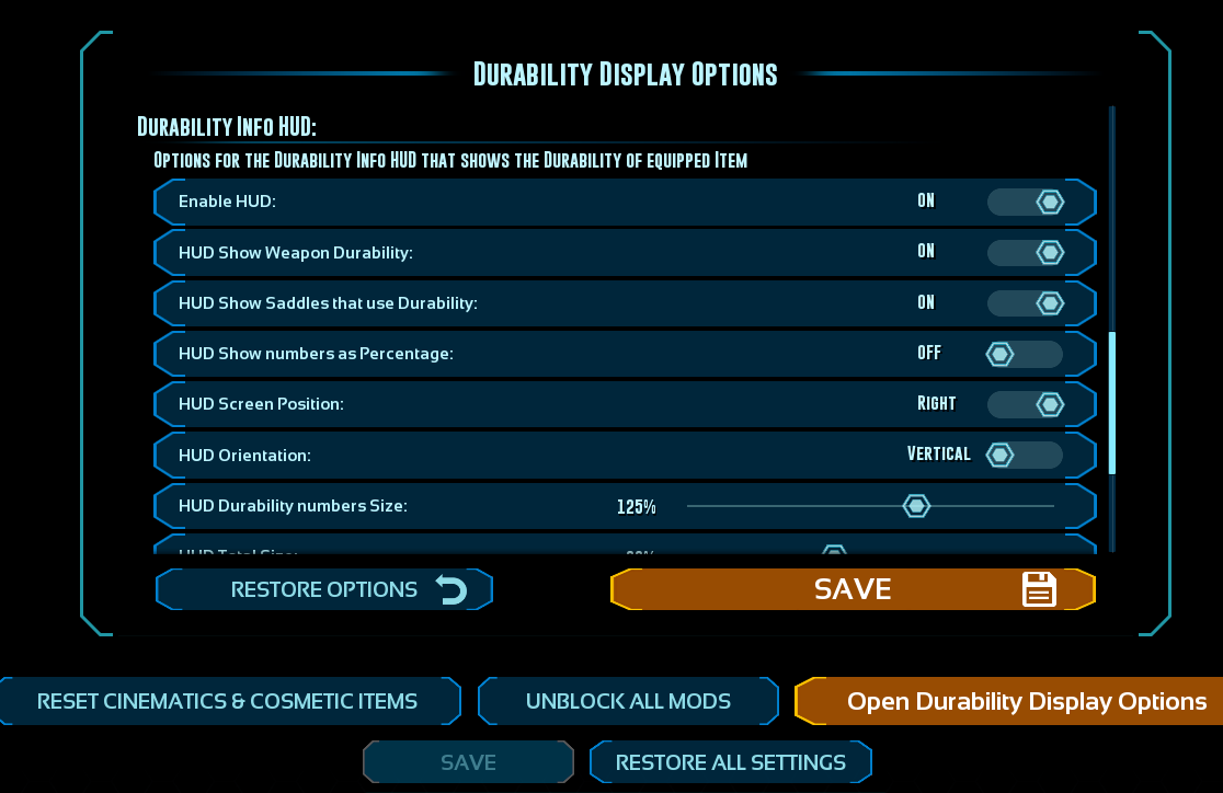 This mod displays durability numbers directly on item and blueprints inside any inventory and on your Quick Slots. It also comes with an HUD that show the Current durability of equipped Armor, Shields, Weapons and Saddles/Modules that use Durability.