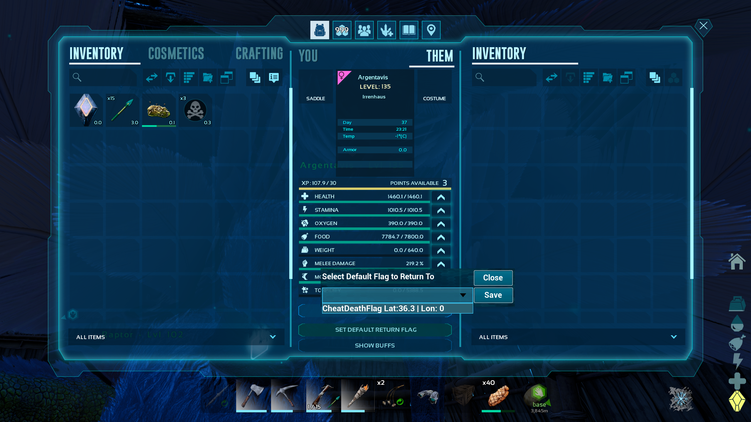 Author: Jods Downloads: 78,037 File Size: 274.2 KB Created: 2023-10-28 Updated: 2025-05-26 Mod ID: 928506 Copied to clipboard Categories: Rebalancing Creatures General Cheat Death (Homing Pigeon reloaded) This mod can save your precious Dinos from certain Death Description Images Engrams Items Cheat Death (Homing Pigeon reloaded) Images select flag Flag image