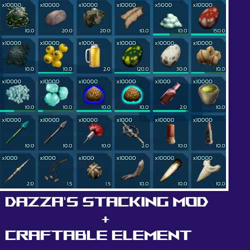 This mod Stacks various items while reducing the weight of all items stacked within the mod. Items affected include: Resources, Consumables, Eggs, Ammunition, Explosives and Tribute Items. This Mod also contains a recipe which can be found within the Tek Replicator where you can craft Element. Tribute Items within the mod can be uploaded/transferred between ARKs (when the feature is added to the game)