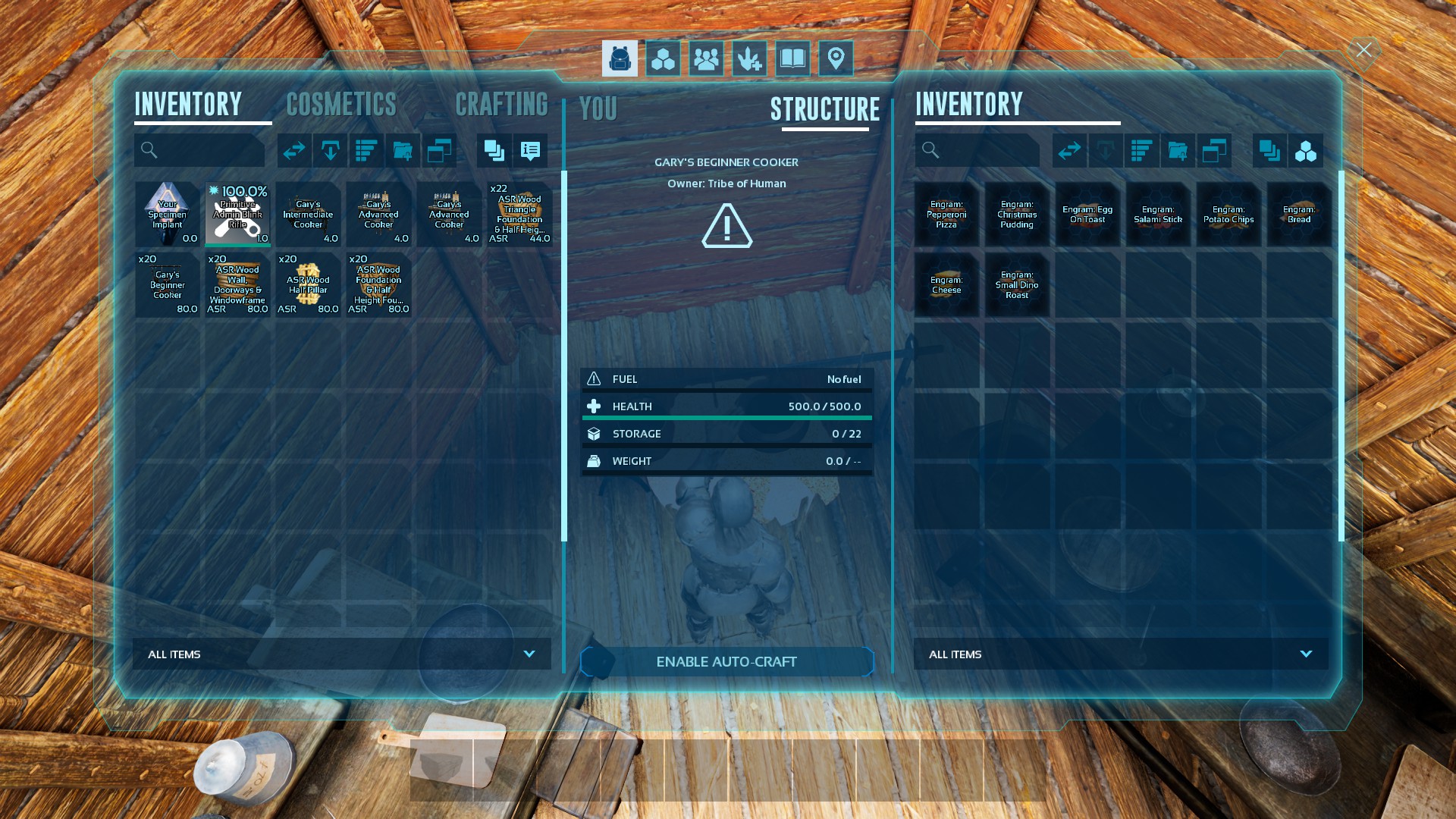 Author: OtterGary Downloads: 10,606 File Size: 94.0 MB Created: 2023-12-20 Updated: 2025-05-29 Mod ID: 946903 Copied to clipboard Categories: General Gary's Cooking Gary's Cooking is an overhaul of arks cooking system providing buffs through different teirs of cooking Description Images Engrams Items Gary's Cooking Images Fishj dish effect Burns all dinos in an area for 15% of their health over 30 seconds Rolled meat effect Heals dinos in an aoe 10k over 20 seconds Gary's Cooking benches Beginner Cooking Bench Intermediate Cooking bench