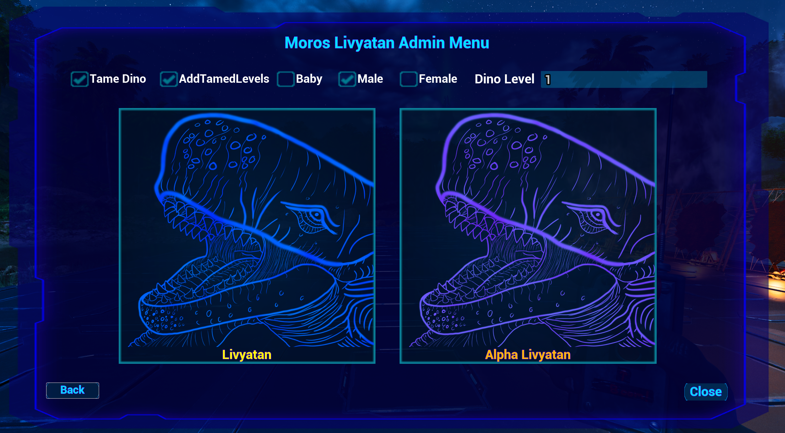 No need for long spawncodes! You can spawn the creatures in with one click of a button! And you can manipulate the level, gender, tamed, level, wild, baby etc.