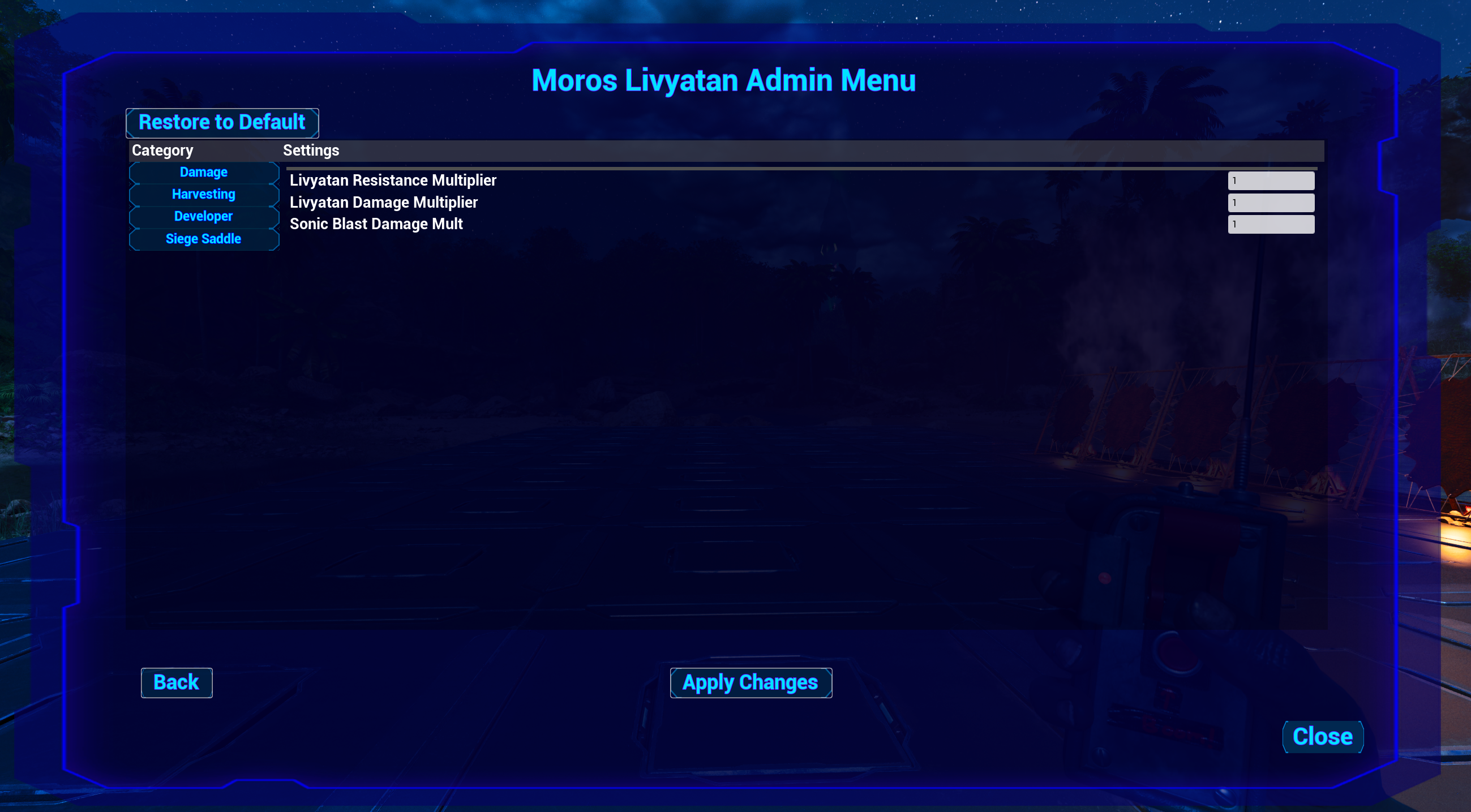 Configure the mod to your liking and balance accordingly to your desire easily at the click of a button! No need for intimidating INI Settings! Configure things like Livyatan resistance, global damage multipliers, certain harvest rates and more!