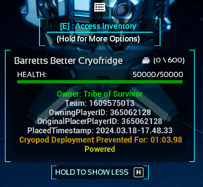 Author: Barrett25 Downloads: 38,796 File Size: 94.1 KB Created: 2024-03-19 Updated: 2025-05-26 Mod ID: 989073 Copied to clipboard Categories: Rebalancing Barrett's Better Cryofridges This mod is a new cryofridge that does not require power, has 600 slots, 50k health and does not have the nerfs the vanilla ones do. Description Images Engrams Items Barrett's Better Cryofridges Images Item Image An image of the in game item/placeable - clean and simple with the default look! HUD The data on the HUD (before the debuffs were removed!)